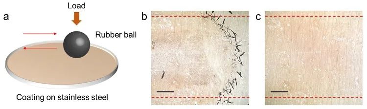 图3. 附着力和耐刮性能测试。(a) 测试实验示意图。以约1.1 MPa的压力将硬橡胶球压在有表面层的不锈钢上,来回刮擦2400次。(b) 测试结束后,光学显微镜图像显示刮擦部位有明显的橡胶碎屑。(c) 洗去橡胶碎屑后,在摩擦区(两条红色虚线之间)没有观察到明显的损耗。(b) 和 (c) 中的比例尺为 500µm。这一优异的附着性可归结于图2所示的表面层中元素的梯度连续分布,其可避免因界面成分突变而带来的各种应力。