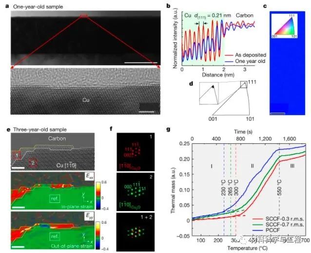 低倍率明场TEM(BF-TEM)图像(图 2a,顶部)和横截面 HRTEM 图像(图 2a,底部)表明,即使SCCF长期暴露在空气中,也没有发生明显的氧化。电子背散射衍射图(图2c)和反极图(图2d)表明,一年后没有发生偏离(111)平面的晶格错位。使用 GPA技术制备的所得应变场图显示覆盖层具有与 SCCF 不匹配的新晶格结构。区域1(图 2f,上)、区域 2(图 2f,中)和两个区域(图 2f,下)的快速傅里叶变换(FFT)模式表明这两个区域属于 Cu2O 和 Cu 相,分别表明部分表面被氧化。然而,氧化表面仅达到几个 Cu2O 层,与多晶 Cu 中的自然氧化物层的厚度相比,这很薄。具有不同表面粗糙度的 PCCF 和 SCCF 样品的比较热重分析清楚地表明,与其他样品相比,具有单原子阶梯边缘的 SCCF 在高温下表现出出色的抗初始氧化性(图 2g)。