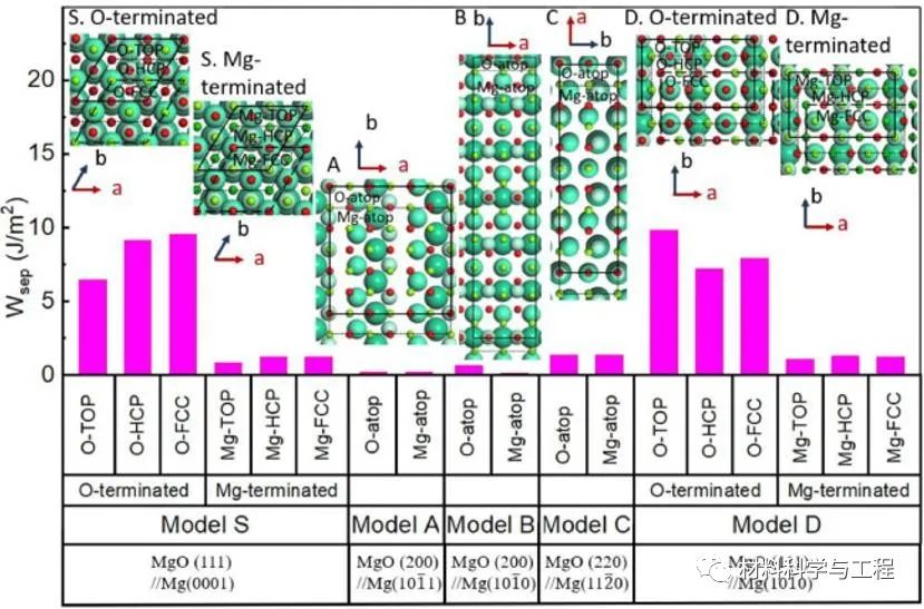 图2. Mg-SiO2镁基纳米复合材料中中非晶态SiO2颗粒增强相与晶体镁基体之间的界面表征。结果表明Mg与MgO 界面之间由于晶面旋转造成大量的位错。并且Mg与MgO之间的原子结合微弱(在图3中用第一性原理表征)。