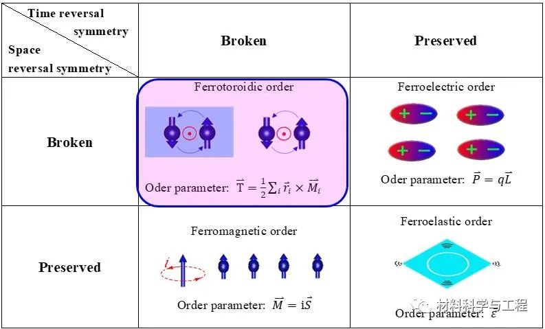 对称性破缺是物质科学研究范式的基本要素之一,铁性(Ferro) 功能材料具有重要且极为广泛的应用价值,铁性序主要包括磁有序、铁电序和铁弹序。磁有序呈现时间反演对称性破缺;铁电序呈现空间反演对称性破缺;在铁弹序中,体系仍保留时间和空间反演对称性;铁涡序(Ferrotoroidicorder)作为一类新的铁性有序将同时破坏时间和空间反演对称性(如图1所示)。