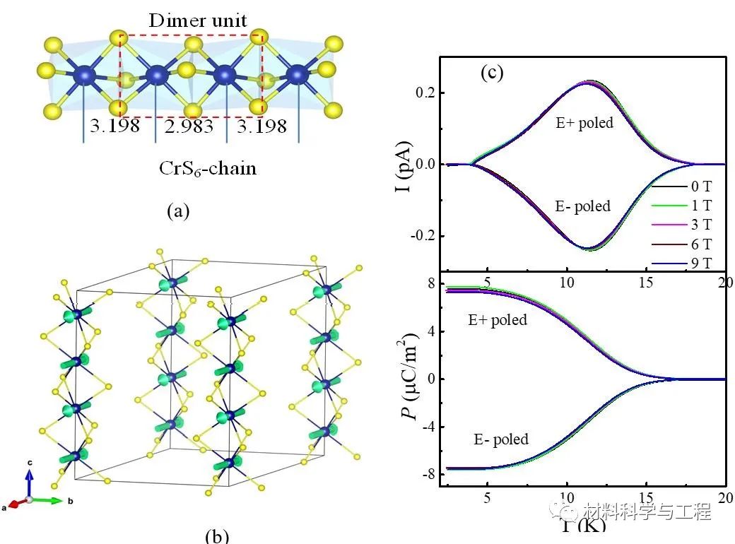 图3、(a)Ba6Cr2S10晶体结构中二聚化的CrS6自旋链。(b)Ba6Cr2S10磁结构。(c)电极化实验测量结果。