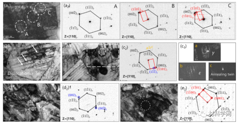 图 8。(ac) 10% 和 (de) 20% 应变 A600–72 的 TEM 分析。(a 1 )TEM BF图像和(a 2 )从(a 1 )中的区域A、B和C获得的对应DP 。区域 A、B 和 C 分别由 γ 单相、γ 和 ε 的混合物以及 γ、初级 ε 和次级 ε 的混合物组成。(b) TEM BF 图像显示由位错和层错(SF) 变形的晶粒。(c 1 ) TEM BF 图像和 (c 2 )从显示 γ、ε 和退火孪晶共存的白色虚线圆圈获得的DP 。(c 3 ) 从 (c 1中的白色虚线框获得的 DF 图像)。