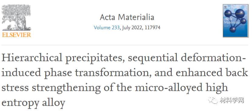高熵合金 (HEA) 或由多主元素组成的复杂合金,其具有巨大的合金设计空间和独特的性质(如晶格畸变、缓慢扩散和鸡尾酒效应)。然而,与传统材料相比,HEA 中使用的大量合金元素导致性能/成本相对较低,从而限制了它们的工业应用。因此,最近的研究已转向开发具有优异机械性能的低成本 HEA 或中等熵合金。李等人提出了新型非等原子 γ (FCC)/ε (HCP) 双相 Fe 50 Mn 30 Co 10 Cr 10 (at.%) HEA,由于相变而表现出相变诱导塑性(TRIP) 效应变形时的 γ 到 ε 相。与传统的等原子 CoCrFeMnNi HEA 相比,这种非等原子 TRIP HEA 显示出显着增强的应变硬化能力。此外,非等原子 TRIP HEA 还表现出双向转换从变形诱发的ε 相到 γ 相,这有助于进一步适应变形诱发 ε 相中的塑性变形。尽管由于非等原子 TRIP HEA 中多种塑性增强机制的激活而具有优异的应变硬化能力,但其相对较低的屈服强度 (YS) 应在实际应用中得到改善。
