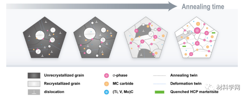 图 4。退火材料在 600 °C 退火时随着退火时间的延长而显微组织演变的示意图。