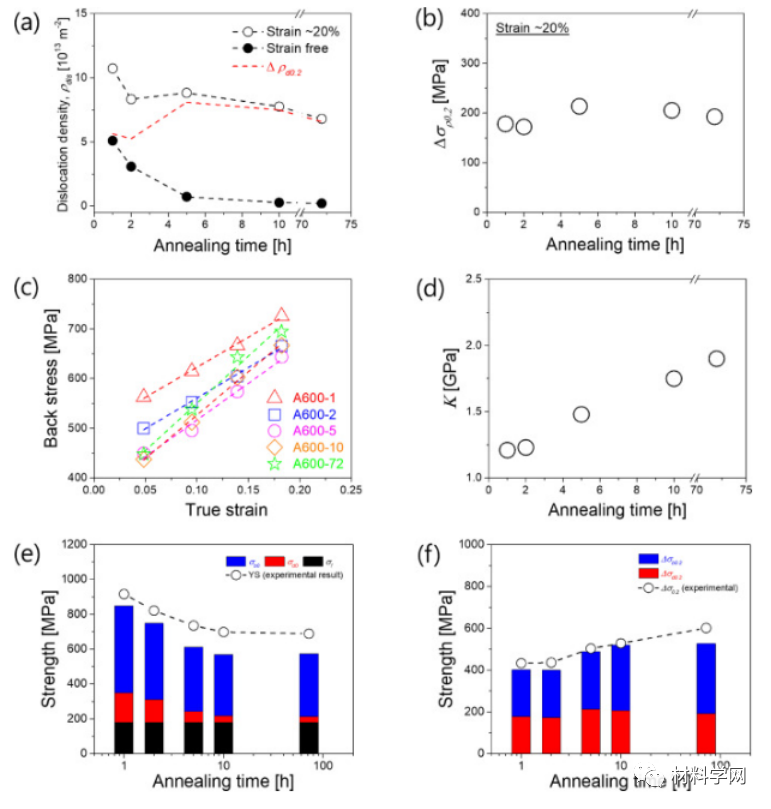 图 12。退火材料的位错强化和背应力强化分析。(a) 位错密度随退火时间的增加而变化。(b) 估计值的变化随着退火时间的增加。(c) 应变相关的背应力强化。(d) 退火后 k 估计值的演变。随着退火时间的增加,k 的增加表明在退火时间较长的材料塑性变形期间背应力强化的贡献更大。(e) 实验测量的 YS 与考虑退火材料的各种强化机制的估计 YS 的比较。(f) 的估计值与实验测量值作为退火时间的函数。