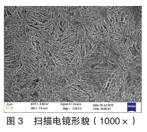 图3为高强弹簧钢LPD65热处理后扫描电镜(1000倍)形貌,分析可知为典型回火屈氏体形貌,且组织分布均匀。