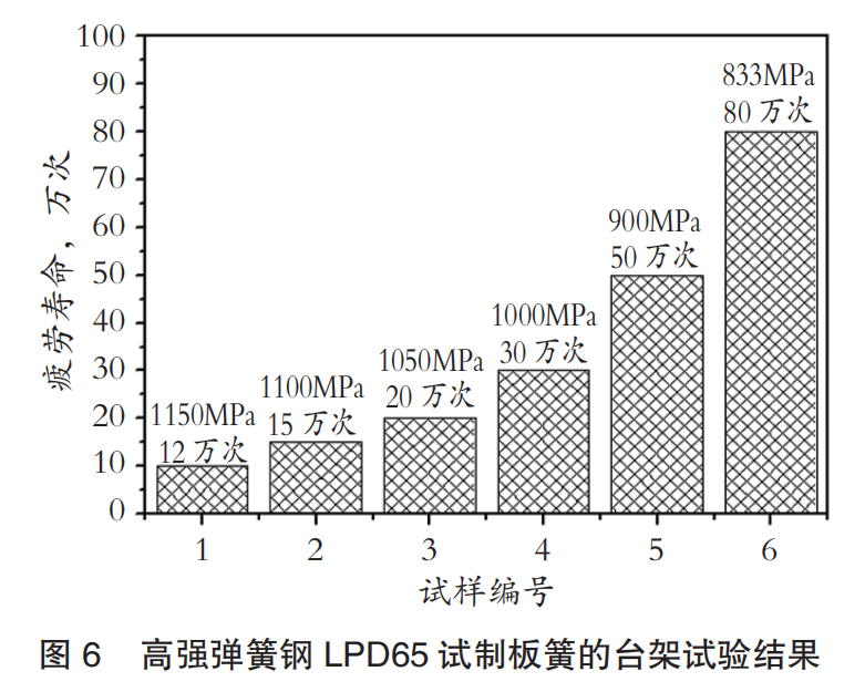 图6是使用高强弹簧钢LPD65试制板簧进行台架试验的结果。由图6可知: