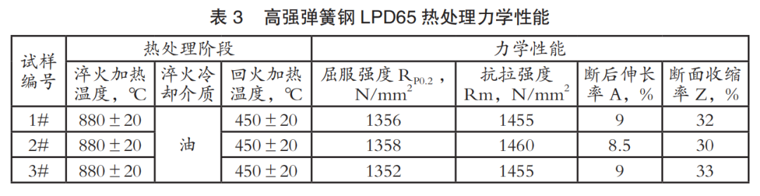 高强弹簧钢LPD65热处理后的力学性能要求如表3所示。在450±20℃的回火范围内,弹簧钢的强度大于1450MPa,断面收缩率≥30%,断后伸长率≥9%。