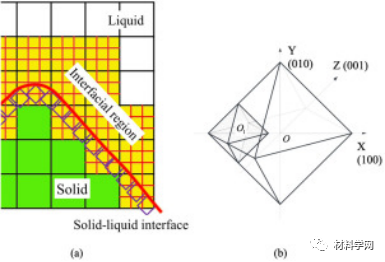 图 1.(a) 多栅格树突生长模型示意图。(b) 偏心八面体增长算法的示意图。(为了解释此图例中对颜色的引用,请参阅本文的Web版本。