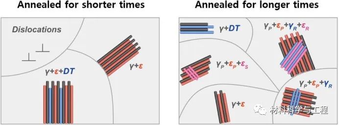 图4 600℃退火后,随退火时间的增加,退火材料的微观组织演变示意图。