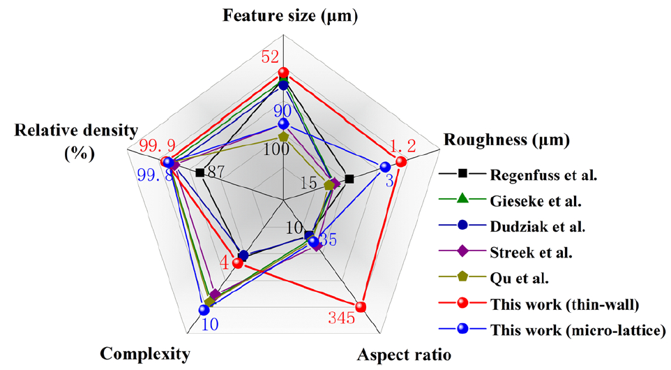 图6. μ-LPBF制备的金属微器件综合性能对比。