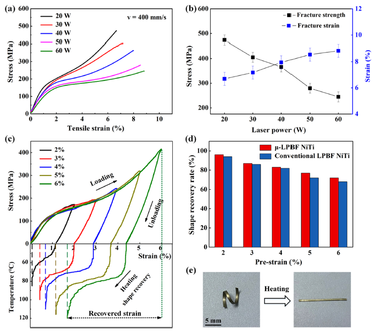 图11. μ-LPBF制备NiTi合金薄壁的拉伸性能与记忆效应。