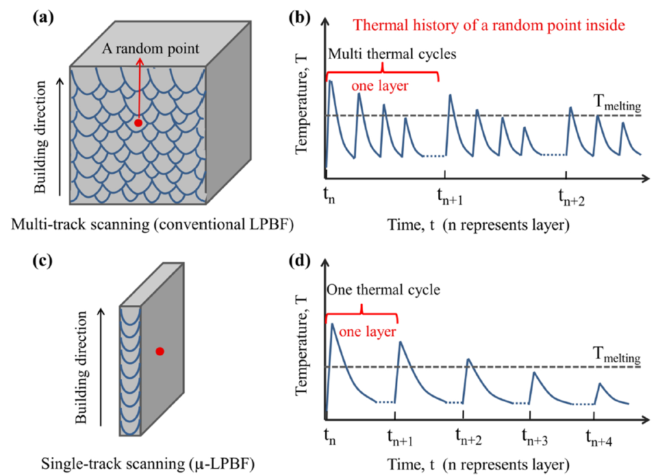图1. 常规LPBF与μ-LPBF在扫描模式和内部某点热历史的区别。
