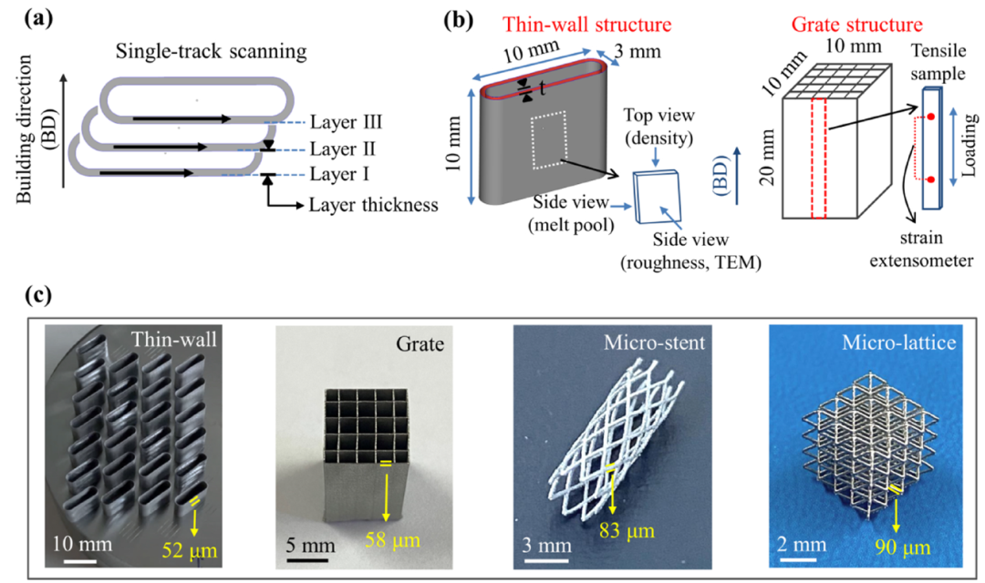 图3. 本文所采用的激光单道扫描方式示意图及制备的多种NiTi合金微器件。