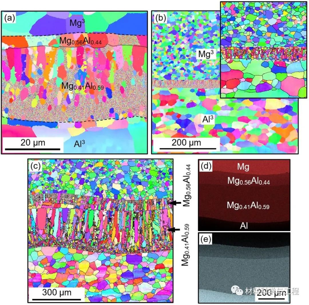 研究发现,在所施加的爆速下只有第一个界面呈波浪状,而其他界面是半平坦或平坦的。在所有界面附近,局部熔化和快速凝固形成了由各种化学成分和结构的相组成反应区域。在反应区域中发现两种平衡相(γ-Mg17Al12和β-Mg2Al3),大部分凝固的熔体由非平衡相组成,呈现出无定形或超细晶粒结构。构成反应区域的相显微硬度在358-419 ?HV范围内,约是Al的8倍和Mg的5倍。母板的界面层经历了严重的塑性变形,导致晶粒细化。多层复合材料的后续热处理诱导了高硬度γ-Mg17Al12和β-Mg2Al3层的快速形核和生长。在预先存在的反应区域内,具有各种化学成分的区域系统地转变为β-Mg2Al3相。结合区域作为β-Mg2Al3相形核中心,加速了加热过程中Mg和Al之间的反应。