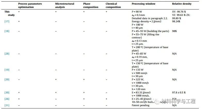 表1 应用Ti-Nb-Zr粉末为L-PBF原料的工艺比较