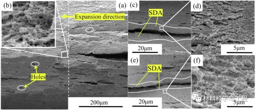 图7 ANHS试样的拉伸断口形貌有大量微孔聚集(a),裂纹尖端被凹坑堵塞(b)。WRHS样品(c)有较深的裂纹,裂纹两侧有光滑的凹坑区(SDA),远离裂纹(e),凹坑的密度增加(f)。