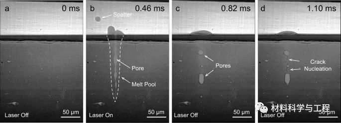 图2 成分与0.11Si样品相近的标准IN738LC板稳态激光加热实验裂纹形核的原位同步成像。