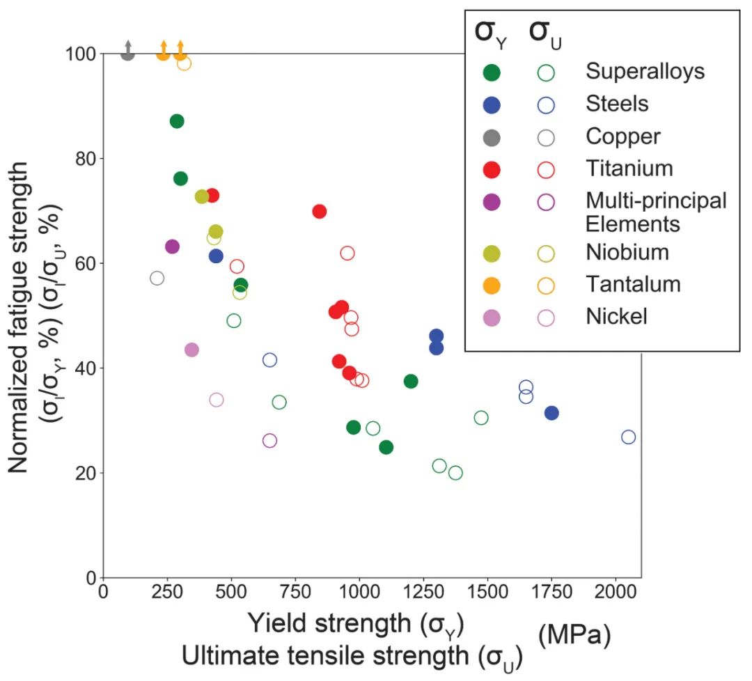在高或非常高的循环疲劳状态下的疲劳强度与金属材料的固有力学性能之间的相关性,包括屈服强度、极限抗拉强度和硬度,在文献中得到了广泛的报道。最有趣的是观察到疲劳强度随着屈服强度或极限抗拉强度的增加而增加。然而,绘制归一化疲劳强度与金属屈服强度或极限抗拉强度(图1)显示,在许多情况下,具有高强度的金属材料在应力低至屈服强度的25%时因疲劳而失效,表明疲劳效率明显较低。在微观结构尺度上连接拉伸、屈服强度和疲劳强度的物理过程和参数尚未完全了解。此外,为什么拉伸强度高的金属和合金具有如此低的疲劳效率也不清楚。大量的疲劳建模工作,使本构模型与大量的疲劳试验数据相匹配。