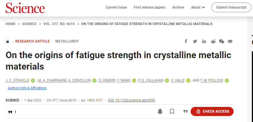 在此,美国伊利诺伊大学厄巴纳-香槟分校(UIUC)J. C. Stinville教授团队等人 本工作通过在循环的最初阶段考虑大量单个材料的纳米分辨率的循环变形过程,识别出大量面心立方、六方密排和体心立方金属材料的疲劳强度的物理起源。确定了屈服强度与极限抗拉强度、疲劳强度和早期滑动局部化事件的物理特性之间的定量关系。通过滑动变形的金属合金的疲劳强度可以通过在第一个加载循环期间滑动局部化的幅度来预测。为众所周知的经验疲劳定律提供了物理基础,并实现了一种快速预测疲劳强度并设计抗疲劳材料的方法。相关研究成果以题“On the origins of fatigue strength in crystalline metallic materials”发表在国际著名期刊Science正刊上。