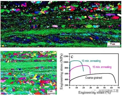 看来,我们对材料科学的传统理解往往不足以解释HS材料的机械行为,在我们设计具有优异性能的HS材料之前,还有许多科学问题需要解决。例如,异质结构钛通过冷变形加工,然后进行部分再结晶退火。冷变形产生了具有高强度但低延展性的纳米结构。退火降低了整体位错密度并产生了一些大的微米级晶粒,根据我们的传统教导,这两者都应该降低强度。然而,异质结构的钛在退火后仍保持高强度,与传统的材料科学背道而驰。