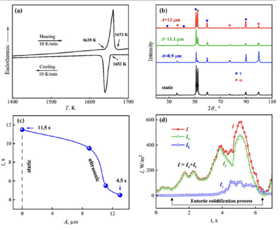 超声凝固作为一种高效、环保的加工技术,有着悠久的历史,已广泛应用于铝合金和镁合金的科研和工业生产中。当超声波在合金熔体中传播时,会引起空化效应、声流和机械振动,从而细化合金的晶粒尺寸,调节合金的形态并提高合金的物理性能。已有研究表明,超声波显著改变了Sn-Pb和Al-Si共晶合金的成核和生长特性,也可以合理推测超声可以调节高熵合金的共晶微观结构。然而,由于高熵合金的液相线温度较高,超声波凝固的研究很少,给其应用带来了技术障碍。在这项工作中,西北工业大学王建元教授团队选择具有共晶结构的高熵FeCoNi2Al0.9合金作为研究对象,在这种液体温度高达1673 K的合金上成功应用了不同振幅的20 kHz超声,详细研究了在不同超声条件下共晶的演变和力学性能。讨论了超声场作用下的动态凝固机理。相关研究成果以题“Strength and ductility enhancement of high-entropy FeCoNi2Al0.9 alloy by ultrasonically refining eutectic structures”发表在Scripta Materialia上。链接:https://www.sciencedirect.com/science/article/pii/S1359646222006492(a) DSC曲线;(b) XRD谱图;(c)动态凝固时间与超声振幅的关系;(d)振幅为13 μm的超声凝固声强变化。不同凝固条件下高熵FeCoNi2Al0.9合金的微观结构特征(a)静态凝固过程中共晶结构的BSE图像;(b) 13 μm振幅超声场生长的共晶结构的BSE图像;(c)共晶结构特征尺寸与超声振幅的关系;(d)超声振幅为13 μm的静态试样和超声试样中α和γ相的晶格常数。不同凝固条件下高熵FeCoNi2Al0.9合金的晶体方位(a)静态凝固的EBSD相位映射;(b)静态凝固合金中共晶界面的极点图和取向偏差分布;(c) 13 μm振幅超声场内动态凝固的EBSD相位映射;(d)振幅为13 μm的超声凝固后共晶界面的极点图和取向偏差分布。高熵FeCoNi2Al0.9合金共晶结构中的溶质分布剖面(a)静态凝固合金中的线扫描;(b)动态凝固合金在13 μm振幅超声场中的线扫描;(c)静态和超声凝固后的最大和最小浓度;(d)静态凝固和超声凝固合金的偏析度。静态和超声条件下凝固的高熵FeCoNi2Al0.9合金的力学性能(a)拉伸应力-应变曲线;(b)屈服强度、极限强度和延伸率随超声振幅变化而变化的规律;(c)本研究和文献中共晶结构铸造高熵合金的屈服强度-总伸长率图;(d)该合金与其他具有共晶结构的静态高熵合金的极限抗拉强度比较。综上所述,将功率超声应用于高熵FeCoNi2Al0.9合金的凝固过程中。凝固组织由L12和B2共晶相组成,其晶格常数在超声作用下明显增加。随着超声幅值的增大,共晶结构随排列层状共晶体积分数的增加而显著细化,共晶相间的相干度显著增强。超声还促进了共晶生长中溶质的扩散,抑制了L12和B2的微偏析稳态空化和声流是调节共晶组织演变的主要因素。该合金的屈服强度、极限强度和总伸长率同时提高,其最大值分别提高了23%、21%和19%。结果表明,超声凝固是改善共晶组织高熵合金力学性能的有效途径。