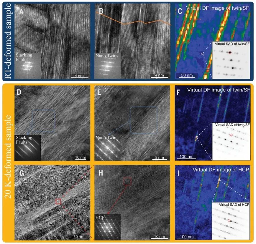 CrCoNi合金裂纹尖端的电子背散射衍射(EBSD)分析。图片来源:Science研究者认为,低层错能推动的形变模式的不同,或许是导致低温断裂韧性增强的主要原因。室温下,CrCoNi的断裂面也存在纳米孪晶或层错,尺寸约为几纳米,而20 K下,纳米孪晶和堆叠断层尺寸非常微小,且出现了典型的六方紧密堆积相(hcp),这是室温断裂面所没有的。理论计算表明,hcp相比面心立方相(fcc)更稳定,而低温条件限制了位错运动和孪晶生长,因此增加了孪晶和hcp相的形成。