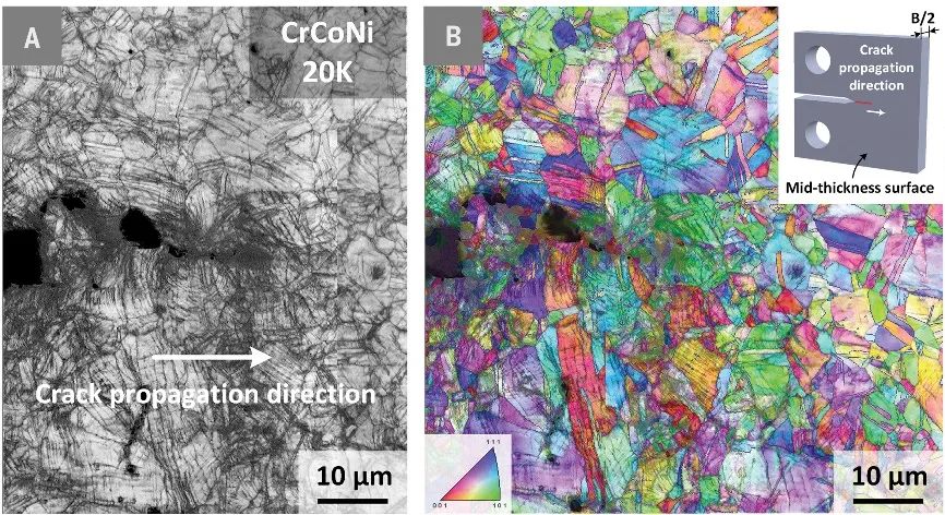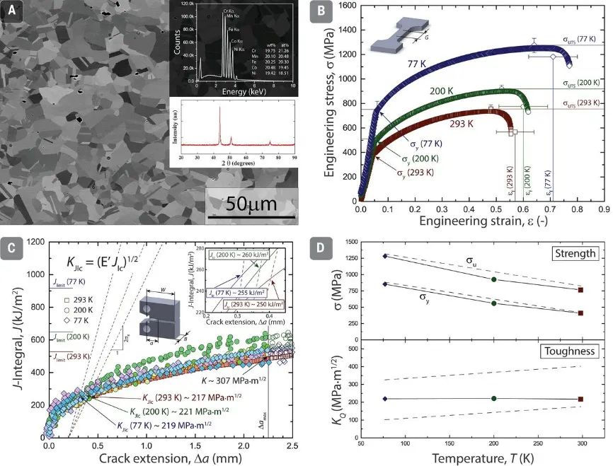 CrMnFeCoNi高熵合金的结构和力学性能。图片来源:Science [2]在这种五元高熵合金的基础之上,近日Robert O. Ritchie团队又在Science 杂志发表论文,报道了一种由铬、钴和镍(CrCoNi)组成的三元高熵合金,这种金属材料不仅具有极高的延展性和强度,其低温(20 K)断裂韧性更打破了迄今为止的记录。机理研究表明,三元高熵合金的低温断裂韧性要归因于相变与其他微观结构的协同作用,防止裂纹的形成和扩展。