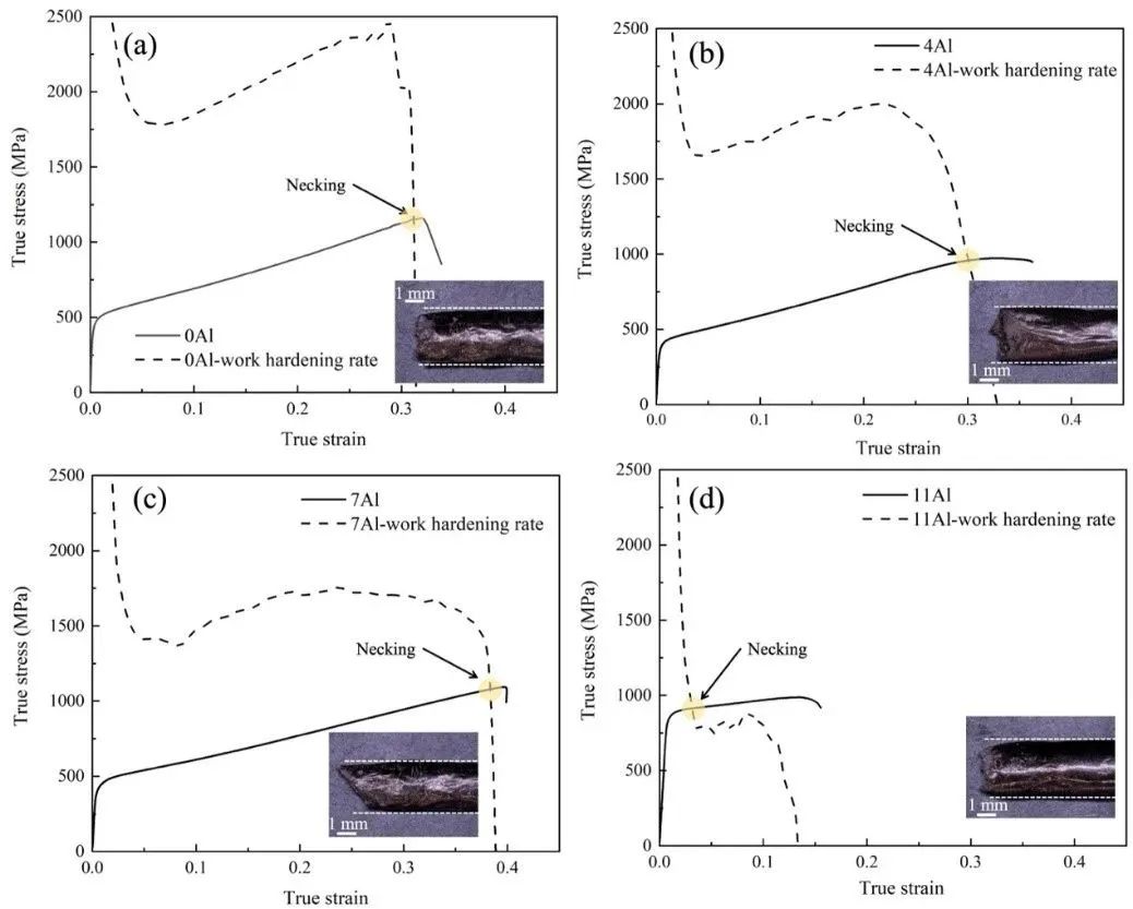 高锰钢(Hadfield steel)作为最重要的耐磨材料之一,被广泛应用在矿山、冶金、水泥、电力、建材、铁路、海工等国家关键行业中。它在面临冲击磨损过程中 的强冲击和大压力等问题时表现出的优异耐磨性,是其他材料难以比拟的。这主要归功于高锰钢出色的加工硬化能力,然而也正是需要依靠加工硬化,使得高锰钢在低应力磨损条件下服役效果不理想。同时,“双碳”战略目标要求高端粉磨破碎装备具备运转高效化及低能耗化,关键核心耐磨构件材料的轻量化是重要途径之一。为实现高锰钢的轻量化效果,铝元素被考虑添加到高锰钢中,并配合合适的热处理与人工时效强化,可以进一步提升低密度高锰钢的力学性能。但是如何调控铝元素含量并配合后续热处理工艺制度是一个比较复杂的问题,长期以来受到国内外学者关注。 近期,针对上述问题,广东省科学院新材料研究所(以下简称“省科学院新材料所”)先进钢铁研究团队联合香港生产力促进局及乌克兰国家科学院合金物理工艺研究所,深入开展了低密度高锰钢的元素与热处理制度设计、性能优化及变形与断裂机制等方面的研究。结果表明,铝元素的加入能够显著降低高锰钢的密度,当加入量达到11 wt.%时,高锰钢的密度下降幅度达到13.3%。在组织方面,铝元素对高锰钢奥氏体晶粒有一定的细化作用,可带来一定程度的细晶强化效果;随着更多铝元素的加入,钢基体中开始出现明显的铁素体第二相。更重要的是,高锰钢的屈服强度可由最初的504MPa提升到870MPa,极大提升了高锰钢的抗变形能力。进一步分析发现,高锰钢的变形机制和断裂机制均发生了改变:由于铝加入对短程有序结构的促进,位错滑移机制由波状滑移向平面滑移转变;而通过调整高锰钢中铝元素含量,可以调控高锰钢强韧化机制从孪生诱发强化转变为变形带强化;结合后续高温水韧处理配合低温人工时效热处理,引入纳米级κ-碳化物析出相可以提升材料表面硬度,不过铁素体第二相的析出促进了锰钢在变形过程中裂纹的形成、形核和扩展,导致材料易出现脆性断裂。该研究结果证实了通过铝元素添加实现低密度耐磨钢设计的可能性,并有望拓展耐磨高锰钢在低应力磨损工况下服役的应用。 图1 铝含量对低密度高锰钢拉伸与加工硬化性能的影响规律 图2 不同铝含量对低密度高锰钢强韧化机制与析出相强化的影响规律(孪生诱发强化(a-Al)→变形带强化(b-4Al&c-7Al) →纳米级κ-碳化物析出强化(d-11Al)) 相关研究成果发表于材料科学领域期刊《Materials Science and Engineering: A》(中科院1区Top),省科学院新材料所郑志斌博士为论文第一作者,香港生产力促进局杨浩坤博士为论文通讯作者。此前,该研究团队已在低密度高锰钢的研究和应用方面取得系列进展(China Foundry 2022 (19) 359-368、Steel Research International 2022 (93) 2200191、Journal of Iron and Steel Research International 2021 (29) 1446-1454等)。研究工作得到了广东省国际科技合作项目 、国家重点研发计划项目、广东省科学院发展专项及广州市青年科技人才托举项目等的支持。 原文链接: https://doi.org/10.1016/j.msea.2022.144467 https://doi.org/10.1007/s41230-022-2004-3 https://doi.org/10.1002/srin.202200191 https://doi.org/10.1007/s42243-021-00688-x