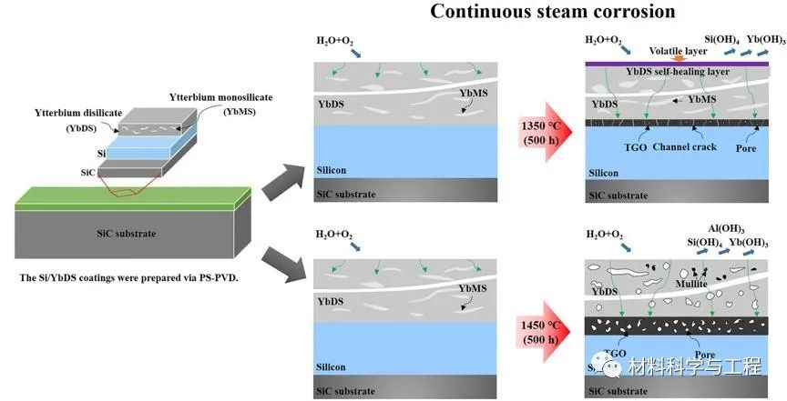 SiCf/SiC 陶瓷基复合材料(CMCs)是高推比航空发动机热端部件的候选结构材料,但在热力化耦合环境下诱导CMCs损害累积引致材料灾难性失稳是其应用的瓶颈,为防止失稳问题出现,在CMCs表面涂覆环境障涂层是行之有效的方法。然而,传统大气等离子喷涂(APS)环境障涂层呈多孔,网格裂纹问题,容易降低涂层服役寿命,因此需要开发高性能环境障涂层。最近,广东省科学院新材料研究所高温防护涂层团队张小锋等人,针对传统APS环境障涂层多裂纹孔隙问题,利用等离子喷涂-物理气相沉积(PS-PVD)制备高致密、少裂纹环境障涂层,并对其抗蒸汽腐蚀行为进行探讨,为开发高性能环境障涂层提供的方向。相关成果在线发表在材料腐蚀期刊Corrosion Science。https://doi.org/10.1016/j.corsci.2022.110831高性能环境障涂层高温蒸汽腐蚀性能研究目前主要集中于硅熔点(~1414℃)以下的使役,作者提出涂层在硅熔点以上进行连续蒸汽腐蚀行为研究。研究表明PS-PVD制备的高致密Si/Yb2Si2O7涂层具有优异的抗蒸汽腐蚀能力。而不同的服役温度(1350℃/1450℃)诱发涂层出现异质形貌(如Yb2Si2O7的自愈),影响氧化介质(H2O和O2)的传质行为,从而导致了TGO的非线性加速氧化和多孔结构形态,如图1所示。上述研究为高性能环境障涂层提供了发展方向,如改善制备工艺参数减少Yb2Si2O7涂层相分离现象,或在Yb2Si2O7层表面添加保护层,以减少TGO的生长,防止多孔结构的出现,实现更长时间的服役。