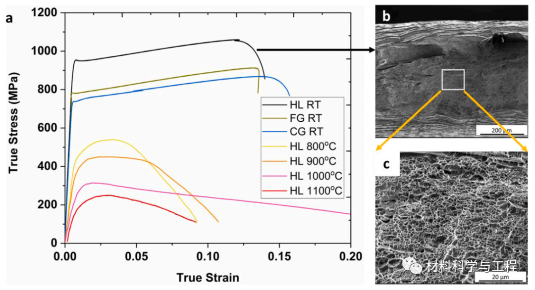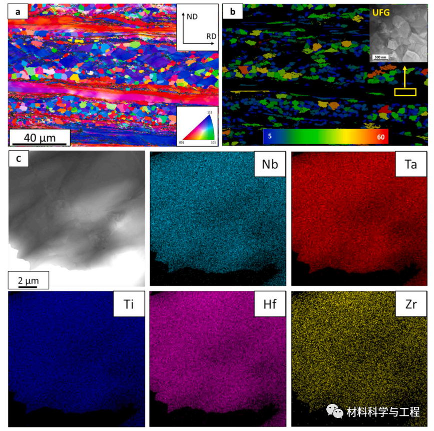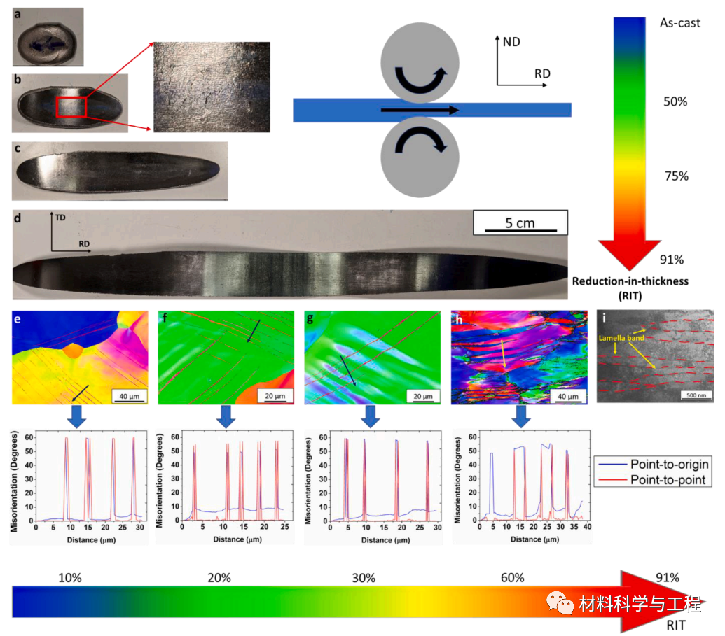 图1. Hf15Nb40Ta25Ti15Zr5RHEA在室温下出色的冷加工性能和相关的变形微观结构。Hf15Nb40Ta25Ti15Zr5RHEA从(a)铸造状态到厚度减少(RIT)(b)50%(出现一些表面缺陷)(c)75%和(d)91%的图像。冷轧Hf15Nb40Ta25Ti15Zr5RHEA的电子背散射衍射(EBSD)反极点图(IPF)和相关的错向剖面图,RIT为(e)10%,(f)20%,(g)30%,和(h)60%。(i) 透射电子显微镜(TEM)明视场(BF)显微照片,在RIT为91%的NTTHZ RHEA中具有高密度位错的片状带。图4. Hf15Nb40Ta25Ti15Zr5RHEA的微观结构和相关元素分布,具有异质层(HL)结构。(a) Hf15Nb40Ta25Ti15Zr5 RHEA在冷轧后的EBSD反极图,RIT为90%,在900◦C退火1小时。(b)恢复状态的超细晶粒(UFG)分布在黑色区域。(c) 轧制和退火的Hf15Nb40Ta25Ti15Zr5中超细晶粒和fne晶粒的扫描TEM显微照片和相关EDS图谱,显示没有元素偏析。图5. 冷轧Hf15Nb40Ta25Ti15Zr5RHEA在不同条件下退火后不同微观结构的EBSD反极点图和相关带状对比图。(a) CR90 Hf15Nb40Ta25Ti15Zr5RHEA在1150◦C退火1小时后的EBSD IPF。(b) (a)图中的相关EBSD BC图像,显示了fine-grained微结构。(c) CR90 Hf15Nb40Ta25Ti15Zr5RHEA在1300 oC退火0.5小时后的EBSD IPF。图6. 具有HL结构的Hf15Nb40Ta25Ti15Zr5RHEA在常温至高温下实现的高抗拉强度-传导性协同作用。(a)具有HL结构的Hf15Nb40Ta25Ti15Zr5RHEA在环境温度和高温(800、900、1000和1100◦C)下的真实应力-应变(SS)曲线。HL-NTTHZ RHEA在室温下拉伸试验后的断裂表面的SEM显微照片,展示了高密度的凹痕和(b)和(c)中的韧性断裂类型。