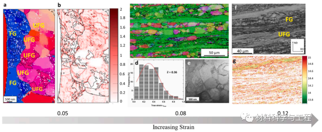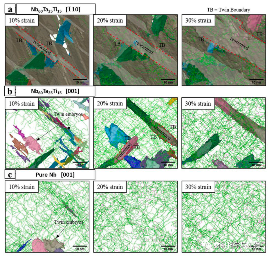 图8. 对压缩的结构演变反应。(a) Nb60Ta25Ti15分别在10%应变、20%应变、30%应变下沿[110]方向被压缩。(b) Nb60Ta25Ti15沿[001]方向受压。Nb60Ta25Ti15内的双子胚胎和双子生长。(c) 纯Nb沿[001]方向受压,变形受纯位错滑移支配。图9. 具有HL结构的Hf15Nb40Ta25Ti15Zr5的拉伸强度与测试温度的关系,与韧性高温金属和合金相比,包括传统的Ni基超耐热合金,难熔金属(Nb,Ta)以及难熔Nb基合金和Ta基合金。图10. 具有HL结构的Hf15Nb40Ta25Ti15Zr5RHEA在不同塑性阶段的变形机制。(a) 变形的Hf15Nb40Ta25Ti15Zr5RHEA的TEM前移电子衍射(PED)IPF,应变为0.05。(b) 从(a)图中的变形试样中提取的相应的核平均错向图(KAM),显示出更高的应变定位和沿界面更强的位错活动。(c) EBSD IPF图像显示在0.08的应变下大多数晶粒沿拉伸方向被拉长;(d) 平均真实应变为0.36的晶粒的应变分布。(f) Hf15Nb40Ta25Ti15Zr5的EBSD带状对比(BC)显微照片,应变为0.12。(g) 与(f)相对应的基于EBSD的晶粒平均GND密度图,显示位错密度的显著异质分布,单位:log10(m-2).