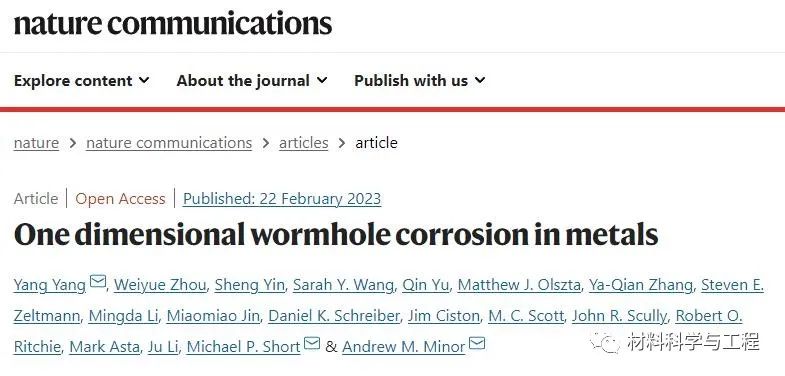 相关论文以题为“One Dimensional Wormhole Corrosion in Metals” 近期发表在《自然-通讯》 (Nature Communications)杂志上。该文的共同第一作者包括PSU的Yang Yang教授和MIT的Weiyue Zhou博士。通讯作者为PSU的Yang Yang教授, MIT的Michael P. Short教授和LBNL的Andrew M. Minor教授。本文是该合作团队在熔盐腐蚀领域发表的第二篇Nature Communications,点击此处查看另一篇。