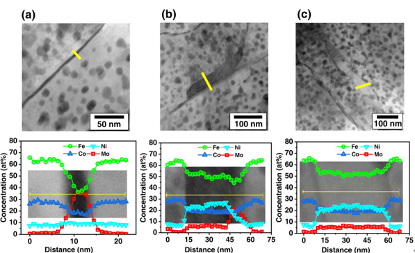图5.A650样品中恢复FCC阶段演变的详细描述。A650老化样品的STEM和相应的EDS浓度剖面说明了(a)存在富钼层,(b)在富钼层旁边形成FCC层,以及(c)独立的FCC层。STEM图像中的黄线表示进行线EDS分析的区域。EDS配置文件中的插图是STEM图像的放大部分,在那里进行了线EDS分析。