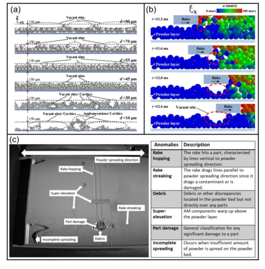图7.粉末床熔合AM过程中粉末扩散动态。(a)粒径与层厚在粉床质量和均匀撒粉方面的关系。(b)动态“壁效应”:耙料推进粉桩时,粉末之间的强接触力将部分颗粒从粉层中拖出。(c)粉层异常图。