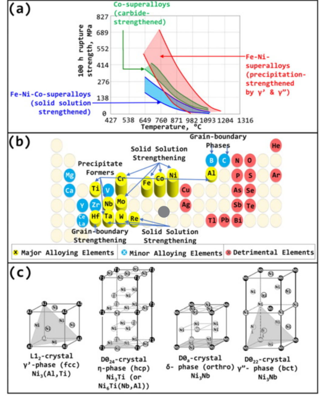 图1.(a) 三种高温合金类别的典型应力断裂行为,即铁镍基、镍基和钴基)。(b) 高温合金中存在典型的合金元素。(c)具有有序晶体结构的几何封闭堆积(gcp)相的晶体结构,即高温合金微观结构中发现的γ',γ“,δ相和η相。请注意,开空心圆表示Ni原子,黑色实心圆圈表示化合物中的M原子(即Al,Ti和Nb);此外,阴影平面显示了晶体结构中最接近的堆积平面。