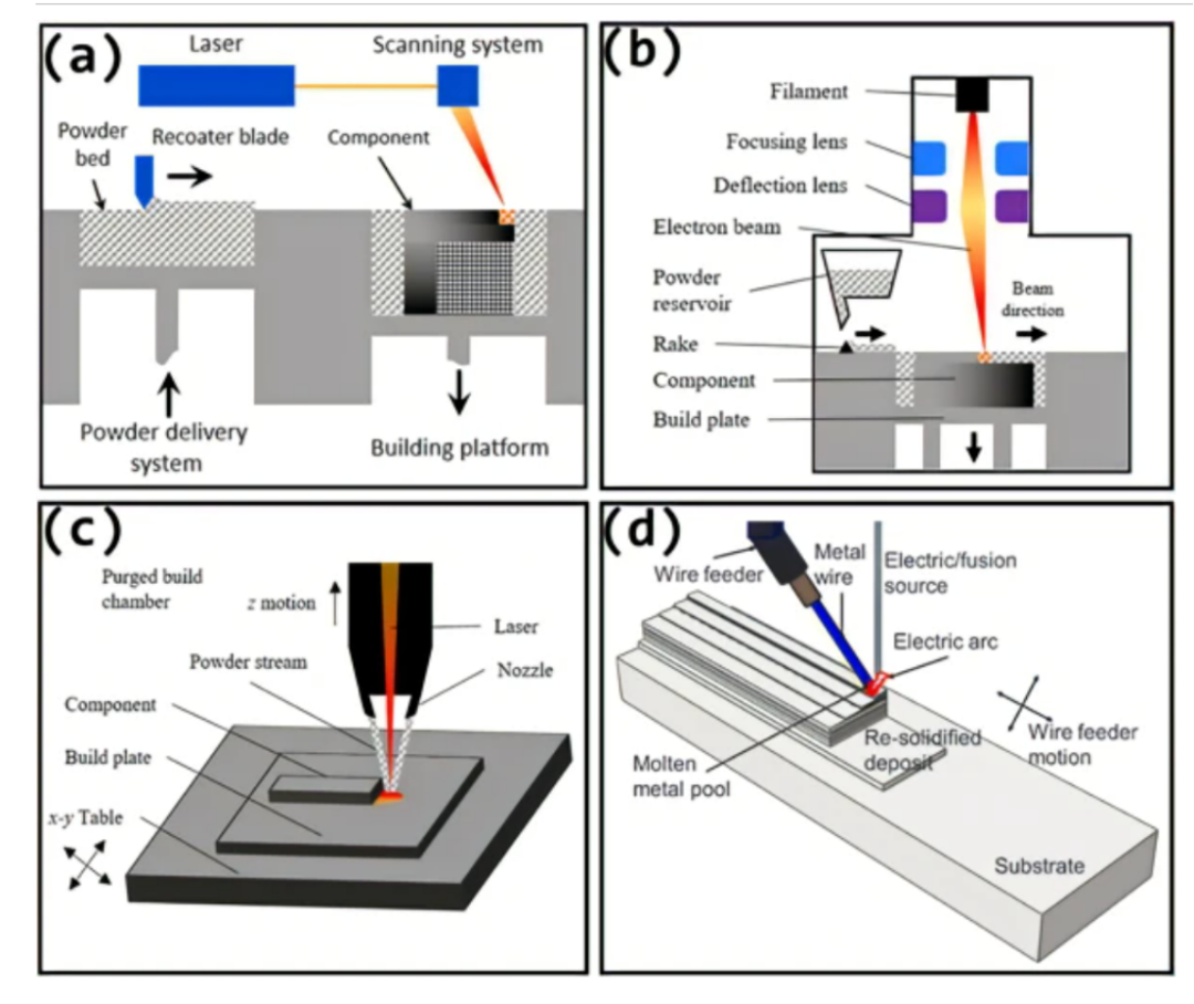图 2.基于熔融的通用增材制造工艺示意图:(a)激光粉末床熔融(L-PBF)。(b)电子束粉末床聚变(E-PBF)。(c) 激光束直接能量沉积 (DED) 和激光熔化、粉末流和保护气体应用的横截面图。(d) 线弧增材制造。