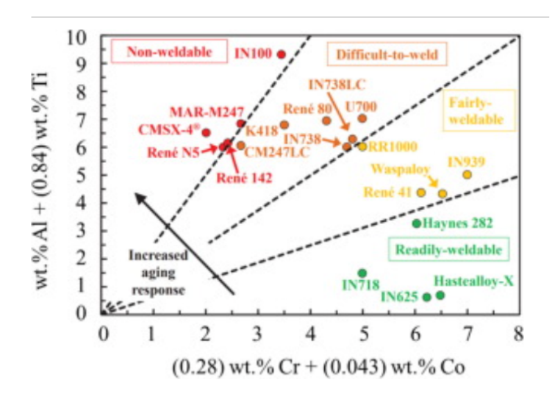 图3.各种高温合金的相对可焊性由Al/Ti与Cr/Co的成分决定。