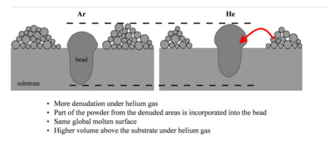 图6.示意图分别显示了在Ar和He气氛下单珠形貌的剥蚀和球化现象的比较。