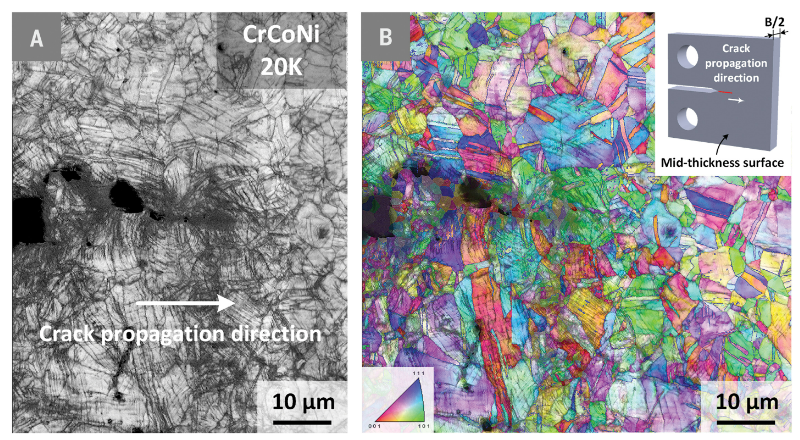图像质量(IQ)和(B)反极点图(IPF)图,显示了CrCoNi合金在20 K下的断裂路径和伴随的变形行为。对于从左向右延伸的断裂,主要的平面应变截面(取于紧拉试样的中厚处)显示了直接位于裂纹尖端(塑性区内)的严重变形区域的微观结构。与IPF着色相关的样品方向是与EBSD扫描平面法线方向。