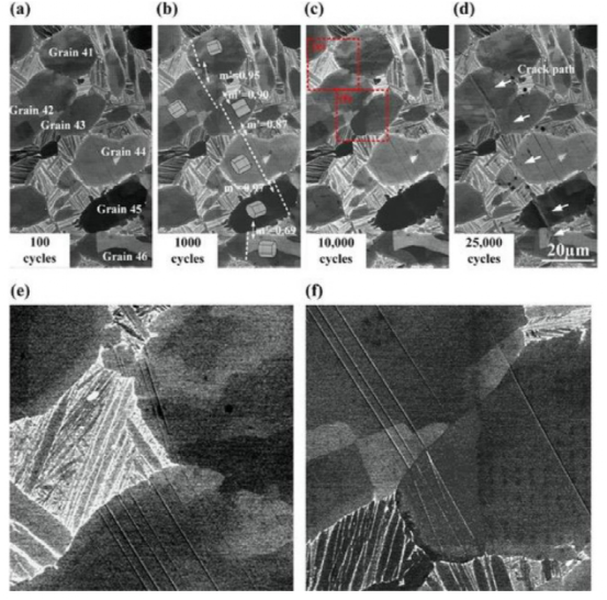 图13.(a) 100次循环,(b) 1000次循环,(c) 10,000次循环和(d) 25,000次循环后,BSE显微图显示S-50中微织构区域的穿晶裂纹的发展;(e)和(f)为(c)的放大区域。