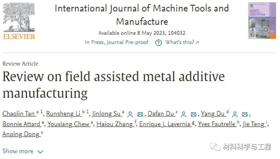 近日,由新加坡制造技术研究院联合中国石油大学(华东),上海交通大学、普林斯顿大学、马耳他大学、华中科技大学、加州大学尔湾分校、湖南大学以及法国EPM咨询公司的学者们在制造领域顶级期刊《International Journal of Machine Tools and Manufacture》发表了题为“Review on field assisted metal additive manufacturing(外场辅助金属增材制造综述)”的综述文章,全文3.5万字,包含8个章节,250余篇文献,涵盖了磁场、声场、温度场、机械场、电场、等离子场、耦合场、模拟等,是目前论述该研究领域最全面的综述。新加坡制造技术研究院谭超林、中国石油大学(华东)李润声为共同第一作者,上海交通大学杜大帆、普林斯顿大学杜杨和新加坡制造技术研究院苏金龙为共同通讯作者。