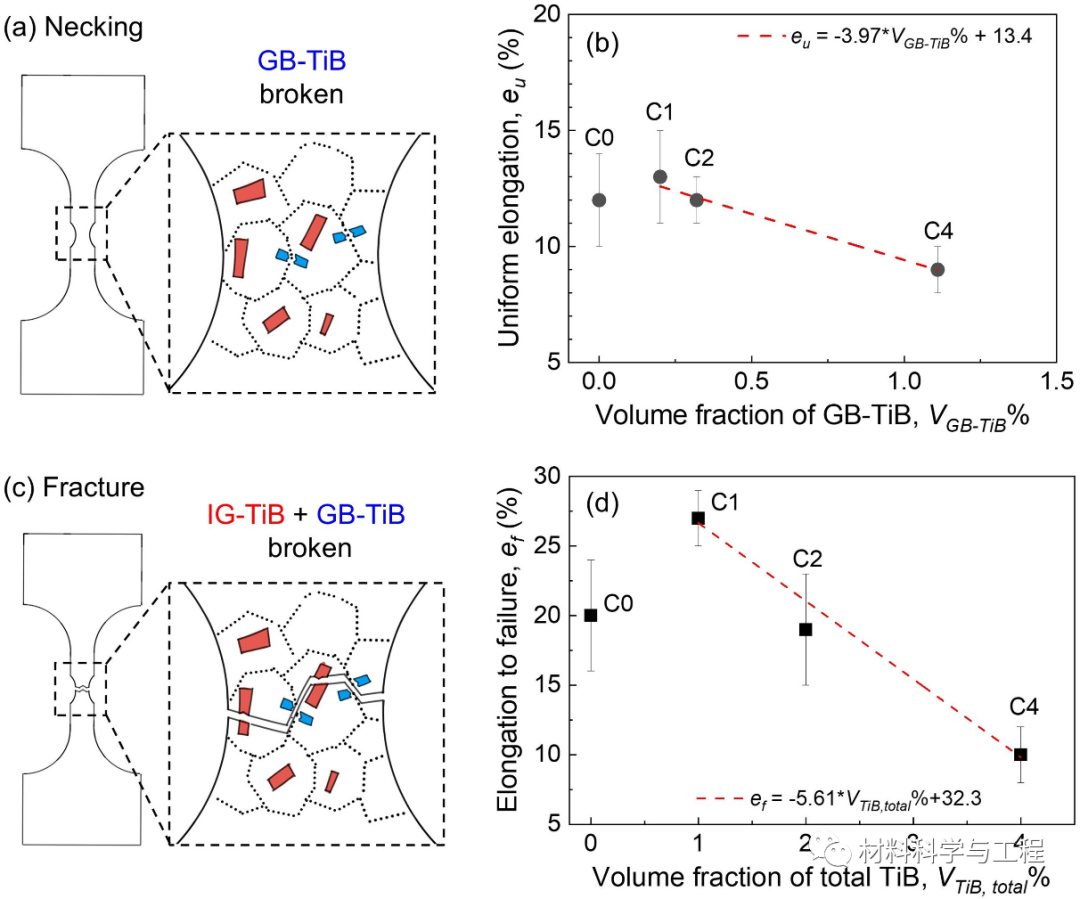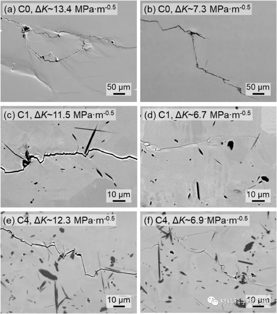 近期,西安交通大学材料学院的高义民教授团队的李强博士生,联合新加坡南洋理工大学的黄升博士、赵亚凯博士和Upadrasta Ramamurty教授,针对钛基复合材料(TMCs, Titanium matrix composites)中陶瓷相添加导致塑韧性降低问题展开研究。相关研究结果以“Simultaneous Enhancements of Strength, Ductility, and Toughness in a TiB Reinforced Titanium Matrix Composite”为题,发表在金属材料领域顶级期刊Acta Materialia上。https://doi.org/10.1016/j.actamat.2023.118995为进一步提高钛合金的比强度、比刚度及高温性能等,常向钛合金中引入陶瓷增强相制备钛基复合材料。但陶瓷相(如TiB)的添加,往往会降低复合材料的延展性和断裂韧性等,这主要是由于增强相颗粒常位于晶界处。该研究采用粉末冶金技术制备了TMCs(其中大部分一硼化钛(TiB)颗粒位于晶粒内),并对其微观组织、室温拉伸性能、I型断裂韧性和疲劳裂纹扩展行为进行了系统研究。结果表明,当大多数微米级TiB均位于晶内时,1 vol.%的TiB添加可实现强度、塑性和断裂起始韧性的同时提高!相对于无TiB添加的纯钛试样,1 vol.%TiB/Ti复合材料的屈服强度(σy)、断裂延伸率(ef)和断裂起始韧性(KQ)分别提高了93.9%、35.0%和67.0%。间断拉伸试验表明,GB-TiB(与晶界相交的TiB)和IG-TiB(完全位于晶内的TiB)在TMC变形过程中的作用存在显着差异。GB-TiB在材料颈缩之前发生断裂,表明它们限制材料塑性的作用;而大多数IG-TiB在材料断裂之前均保持完好,可在材料变形过程中作为位错滑移的障碍,提高Ti基体的应变硬化率。此外,还对制备的钛基复合材料的断裂力学进行研究,例如断裂韧性和疲劳裂纹扩展行为。几个世纪以来,学者们一直致力于研发出更强、更韧、更轻及更耐高温的材料,其中金属基复合材料(MMCs, Metal matrix composites)在过去的50年间收到了广泛关注。钛基复合材料因其高比强度、比刚度、优异的高温性能和较低的热膨胀系数等,在航空航天、汽车和民用等行业都有着很大的应用潜力,可用于替换传统材料以实现减重、提高使用性能和服役温度等目的。虽然已有大量的研究表明,相对于钛合金,钛基复合材料有着更好的高温服役性能,例如高温强度、抗氧化性和抗蠕变性能等,但室温脆性仍是钛基复合材料的一大瓶颈问题!近年来,针对TMCs的室温脆性问题,国内外学者们已开展了一系列研究,例如调控增强相的分布、降低增强相尺寸等,但是绝大部分钛基复合材料的塑性仍低于无增强相添加的钛合金。在本研究中,通过粉末冶金法制备了大部分微米级TiB(~80%)均位于Ti晶粒内部的钛基复合材料。在TiB体积分数为1%的钛基复合材料中,实现了强度、塑性和断裂起始韧性(KQ)的同时增强。对试样进行间断拉伸试验,研究讨论了TiB位置的重要性,结果表明,位于晶内的IG-TiB,在以平面滑移为主的α-Ti基体中,可阻碍位错滑移,促进双系滑移/多系滑移的开动,提高基体的加工硬化率,进而增强材料塑性。对疲劳裂纹扩展行为进行研究发现,在无TiB添加的C0试样中,粗大晶粒是裂纹偏转的原因,而在复合材料试样中,TiB主导了疲劳裂纹的偏转行为。表1. TMCs的化学成分、理论TiB体积分数以及用于制备的AlB2添加量图2. 有代表性的光镜照片:(a)C0试样,(b)C1试样,(c)C2试样,(d)C4试样。(e)随总TiB体积分数变化的GB-TiB和IG-TiB体积分数。(位于晶界的GB-TiB和位于晶内的IG-TiB分别用蓝色和红色突出显示)图3. C0-C4试样的室温拉伸行为:(a)工程应力应变曲线,(b)Kocks-Mecking曲线。图9. C1 样品表面(自由表面)在拉伸测试至约 8.5% 应变(接近颈缩)后的扫描电子显微照片: (a)低倍SEM, (b) 高倍SEM照片显示GB-TiB , (c–d)高倍SEM照片显示 IG-TiB。图11. 表明TiB的断裂主导试样的(a)颈缩和(c)断裂开始的示意图。(b)均匀延伸率随GB-TiB体积分数变化,(d)断裂延伸率随总TiB体积分数的变化。图12. 拉伸应变至~8.5%(接近颈缩)后C1样品的变形机制分析。(a)晶粒取向图(b,e)Grain 1和Grain 2的SEM图像,(c,f)Grain 1和Grain 2的相图,(d,g)Grain 1和Grain 2的KAM图。图13. 疲劳裂纹的侧表面照片:(a,b)C0试样,(c,d)C1试样,(e,f)C4试样。图14. 疲劳裂纹扩展门槛值随TiB总体积分数变化。插入图表示C0和C4试样中的裂纹偏转。