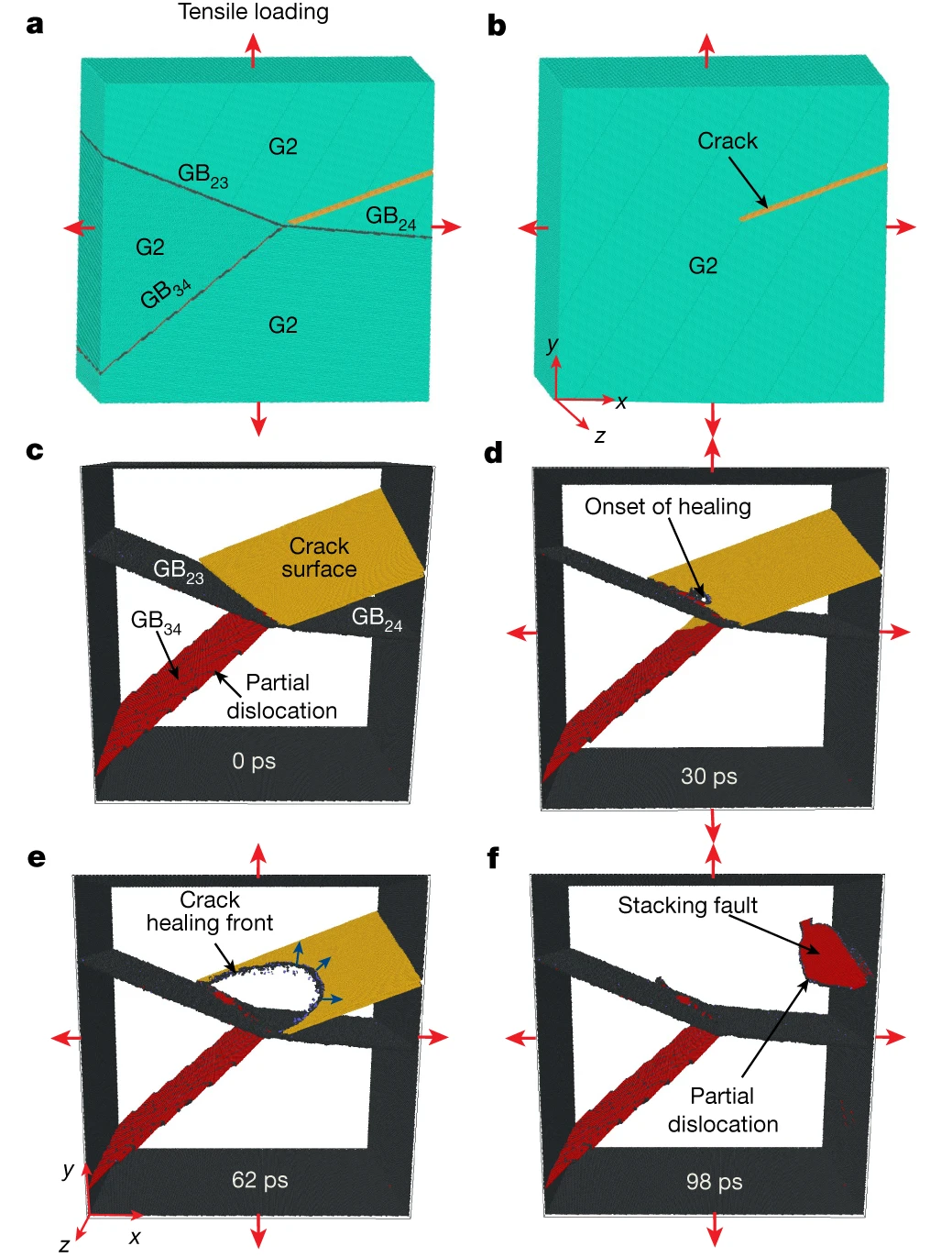 图3. 一个原子模型证实边界迁移,裂纹侧面接触和愈合。©2023 Nature
