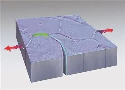 金属纳米级自我修复的艺术渲染图。绿色标记了裂缝形成的地方,然后又融合在一起。红色箭头表示意外触发该现象的拉力方向。图片/桑迪亚国家实验室