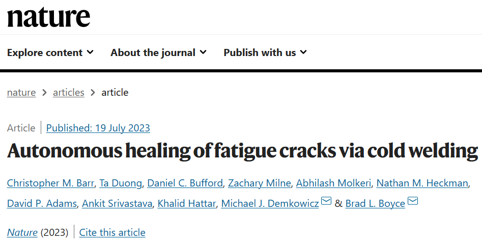 在这场革命中,自我修复的发动机、桥梁和飞机可消除磨损造成的损害,使其变得更安全、更持久。美国桑迪亚国家实验室和得克萨斯农工大学的研究团队19日在Nature上发表,标题为“Autonomous healing of fatigue cracks via cold welding”,进一步揭示了疲劳在各种服务环境中的影响。