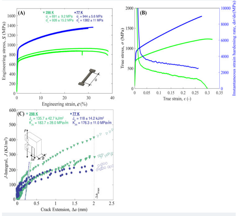( A )在298 K和77 K温度下对试样进行单轴拉伸试验,得到工程应力S -工程应变e曲线。( B )代表真应力,σvs.真应变,ε和瞬时应变硬化率,dσ / dεvs.真应变,ε曲线在298和77K测试的样品。( C )在298 K和77 K下测试的LPBF Cr Co Ni试样的抗裂曲线( R曲线)。