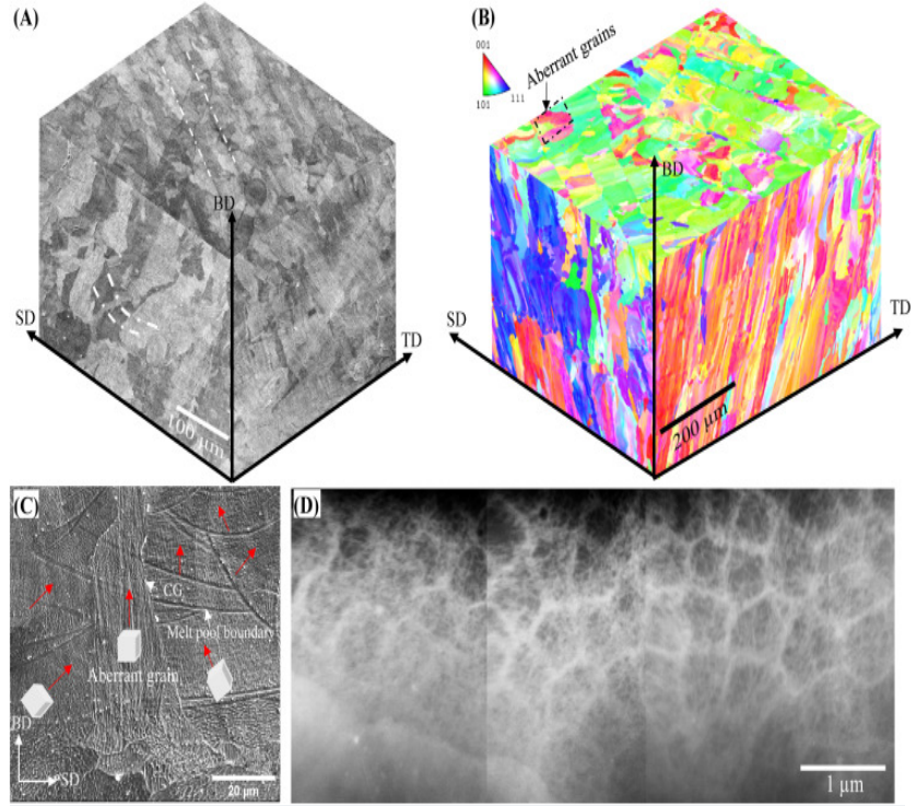 ( A )具有代表性的3D微结构显示激光扫描轨迹(白色点线条)在平行于成形方向的平面上,BD和熔池在垂直于成形方向的平面上,即扫描和横向方向,SD和TD。( B )电子背散射衍射( EBSD )获得的3 - D代表反极图( IPF )图显示激光扫描轨迹内部存在多个晶粒,在SD和TD平面上存在柱状晶。( C )高倍腐蚀图像显示出跨越多个熔池边界的异常晶粒生长。红色箭头指示了熔池内部胞状结构生长的方向。( D )透射电子显微镜( TEM )图像显示了晶粒内部位错的胞状网络。