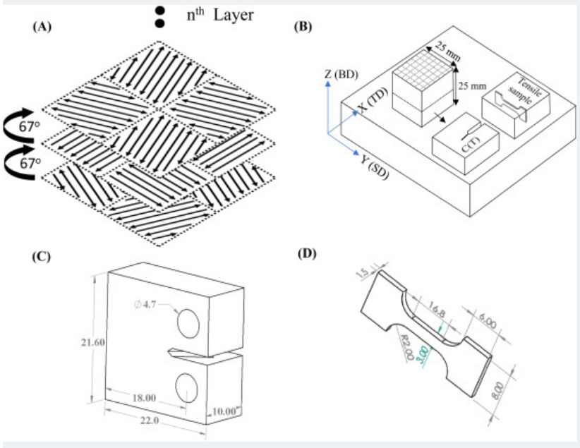 ( A ) CrCoNi样品LPBF工艺扫描策略。( B )紧凑拉伸试样C ( T )和拉伸试样相对于构建板的相对取向,其中Z轴平行于构建方向( BD ),Y轴平行于扫描方向( SD ),X轴平行于横向( TD )。( C ) C ( T )试样尺寸和( D )拉伸试样尺寸。如图。C和D,所有尺寸均为mm。