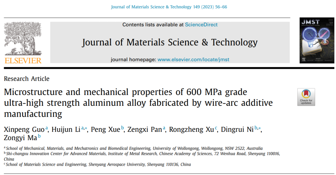 中科院金属所、澳大利亚伍伦贡大学以及沈阳航空航天大学等单位合作,通过设计优化7系铝合金丝材的化学成分,添加孕育剂Sc、Zr元素,优化熔炼工艺以及采用连续挤压成丝新技术,开发了一种适用于WAAM工艺的新型超高强度Al-Zn-Mg-Cu-Sc铝合金丝材,命名为7B55-Sc,采用CMT工艺成功制备了无裂纹的铝合金构件。经过T6热处理后,WAAM的7B55-Sc铝合金的抗拉强度达到了618 MPa,在WAAM铝合金领域首次突破了600 MPa的强度级别。其强化机理是: 凝固时形成的初生微米级的Al3Sc、Al3(Sc,Zr)颗粒在WAAM过程中作为非均质形核核心,促进了细小等轴晶组织的形成;而经T6热处理后,晶内析出大量的与基体保持共格关系的GP区、η′ 相和Al3(Sc,Zr)颗粒是WAAM 7B55-Sc铝合金具有超高强度的主要原因。研究成果有助于实现航空航天领域大尺寸、超高强度铝合金部件的快速增材制造的需求。相关论文以题为“ Microstructure and mechanical properties of 600 MPa grade ultra-high strength aluminum alloy fabricated by wire-arc additive manufacturing”发表在Journal of Materials Science & Technology。